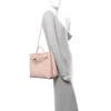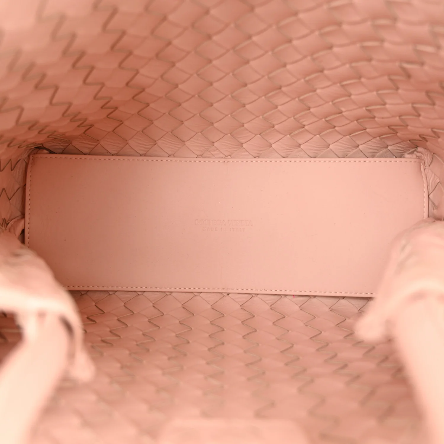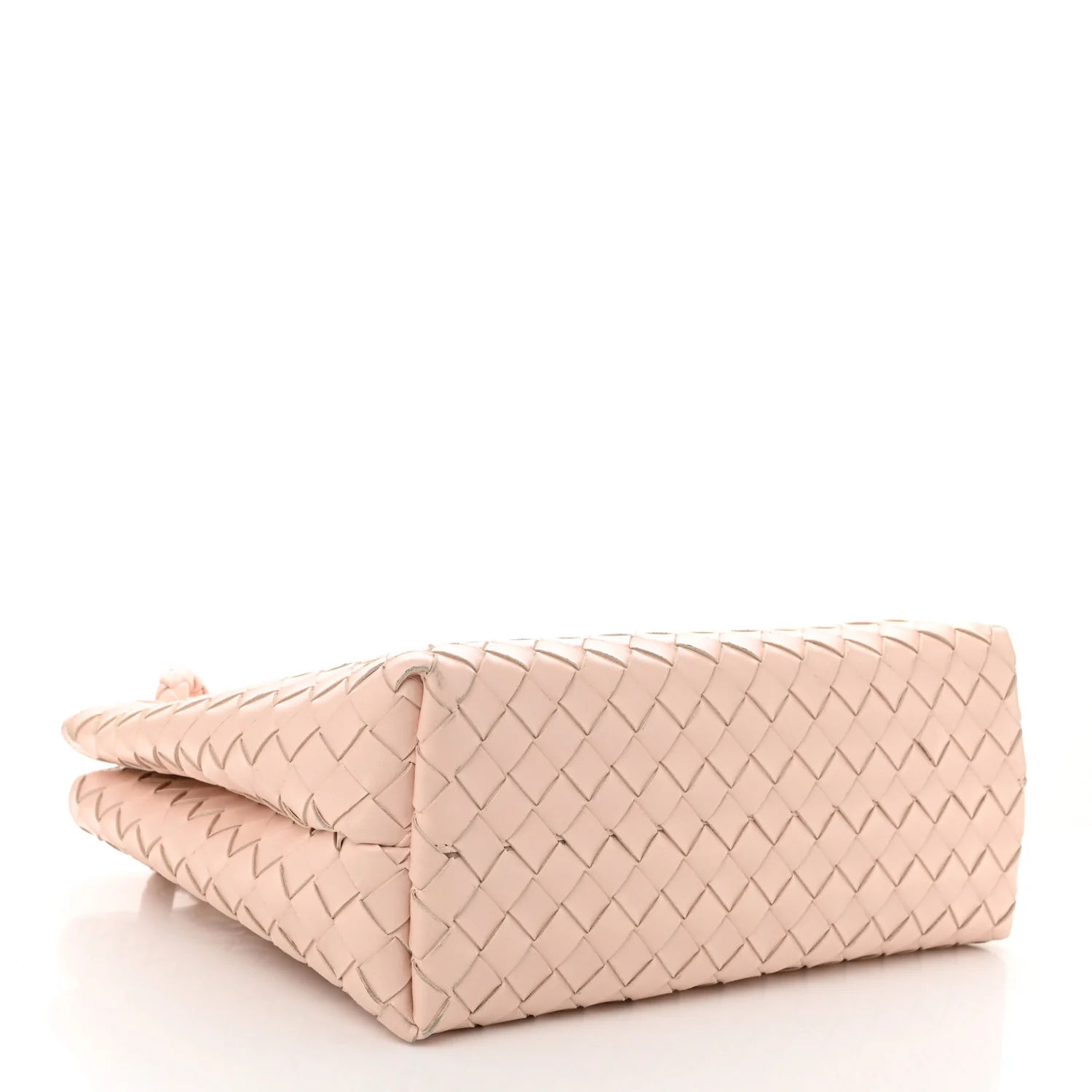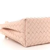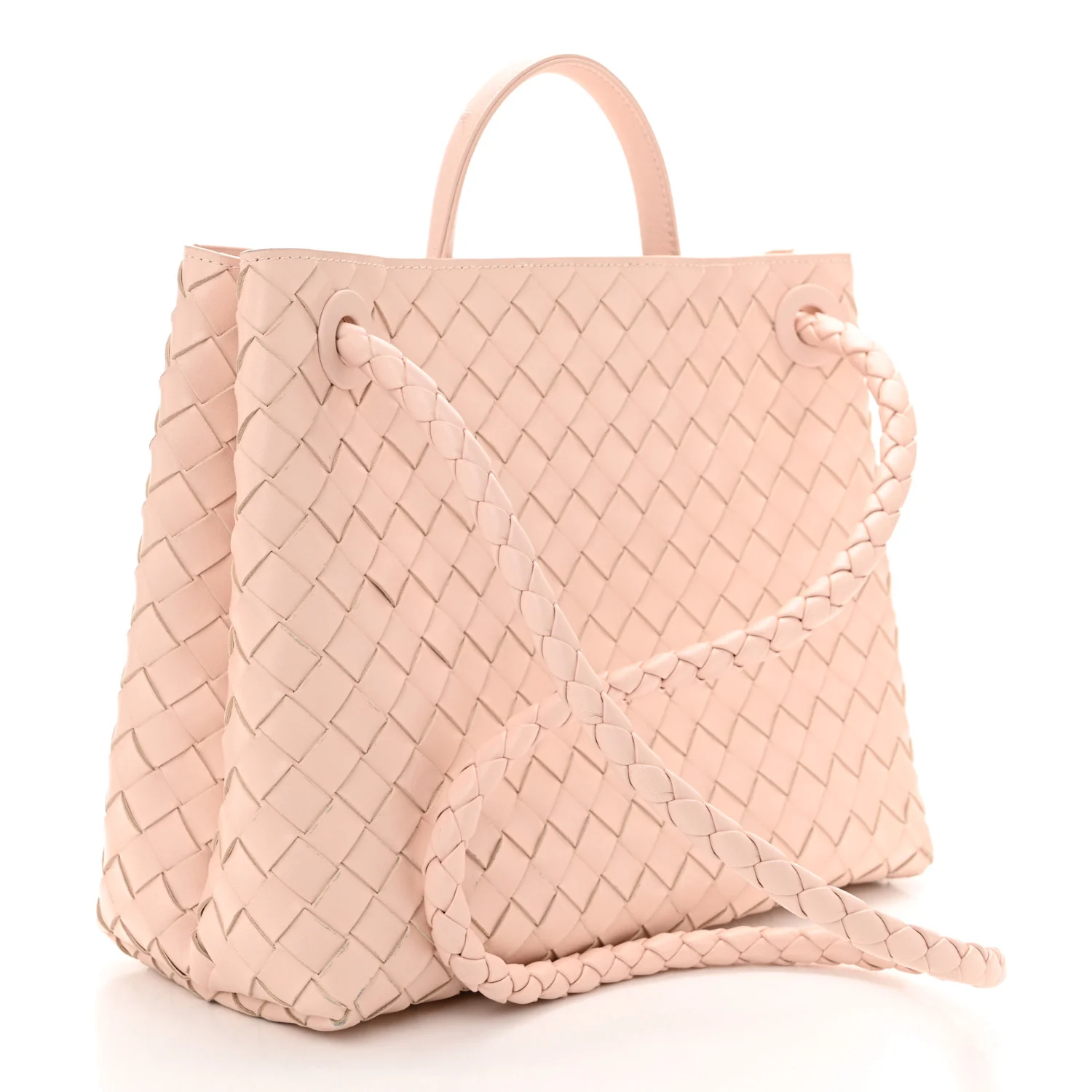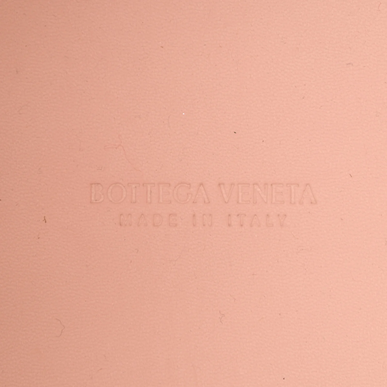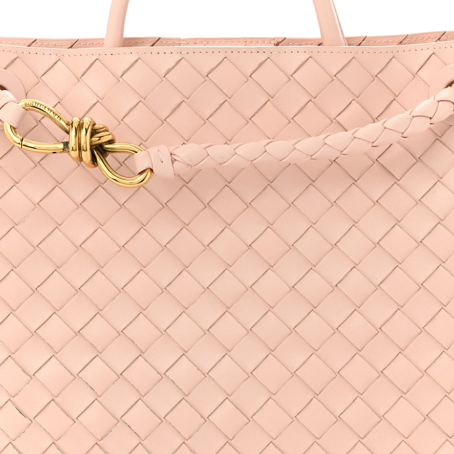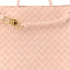 BOTTEGA VENETA Nappa Intrecciato Medium Andiamo Shoulder Bag in Lotus. This stylish bag is crafted of pink nappa leather, mimicking Bottega Veneta’s signature woven detailing. The bag features a leather top handle, and a longer leather strap that can be worn as a crossbody or shoulder bag. The top opens to a matching leather interior with zipper and patch pockets.