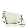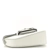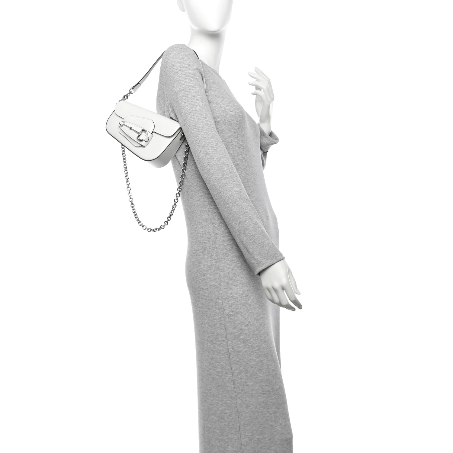 This is a GUCCI Calfskin Mini Horsebit 1955 Asymmetric Shoulder Bag in Great White. This stylish shoulder bag is crafted of white leather, a silver horse-bit detail, a leather handle and a polished silver chain strap. The bag opens to a beige fabric interior.