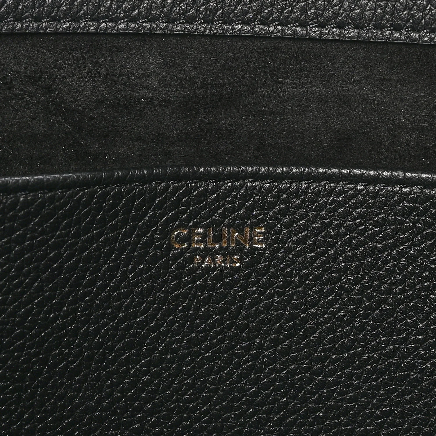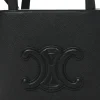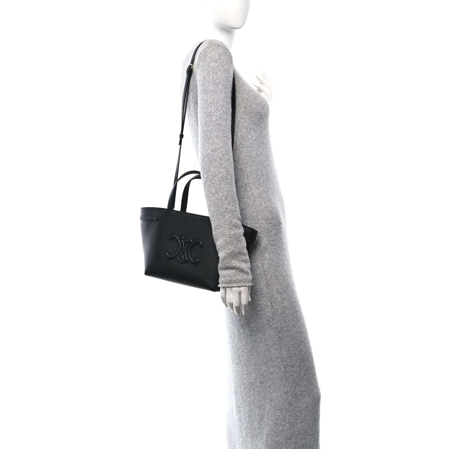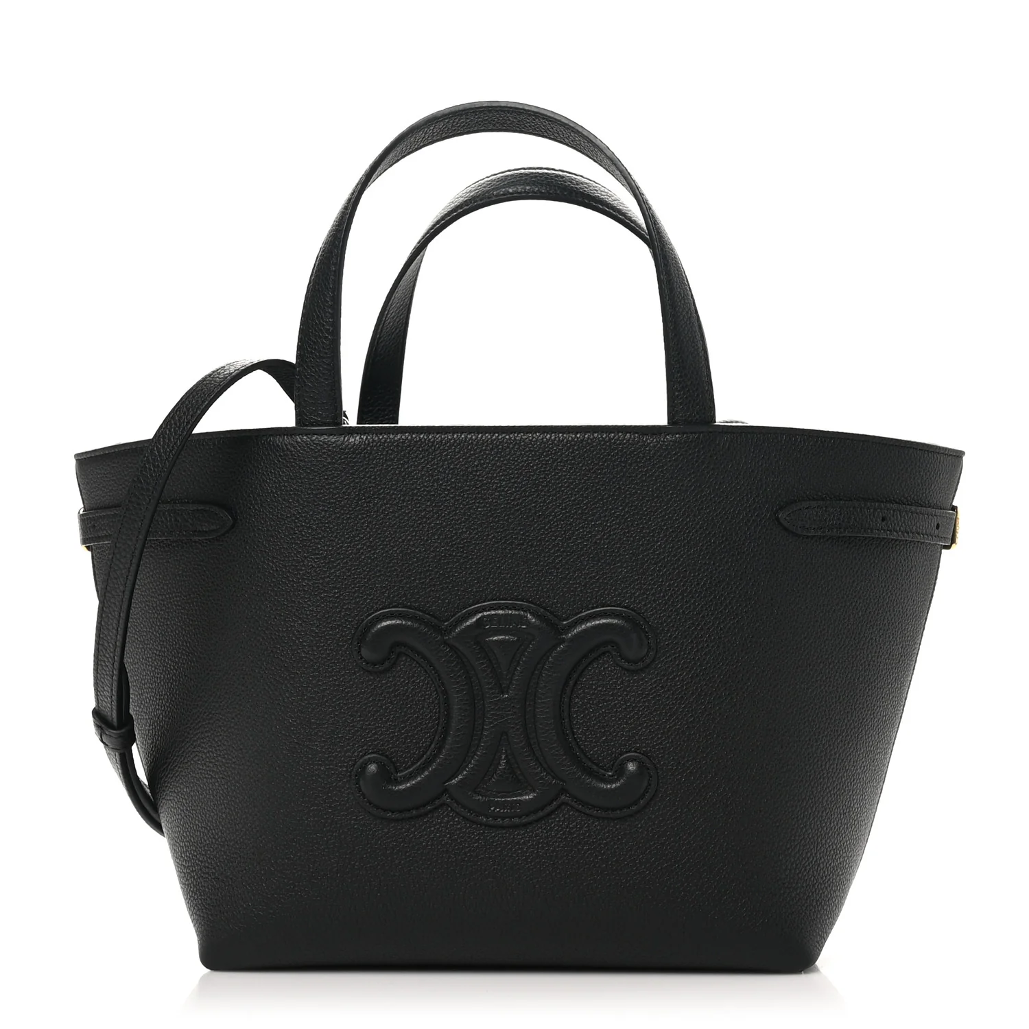 CELINE Grained Calfskin Triomphe Mini Cabas Anais in Black. This tote is crafted with black grained calfskin leather. It features leather strap handles, an optional shoulder strap, and an open suede leather interior with a patch pocket.