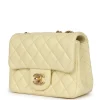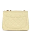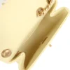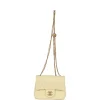 - This Chanel Camellia Crush Mini Flap bag is in light yellow lambskin leather with antique gold tone hardware and features a front flap with CC turnlock closure, back half moon pocket and adjustable interwoven antique gold tone chain link shoulder/crossbody strap with camellia flower attachment.