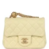 - This Chanel Camellia Crush Mini Flap bag is in light yellow lambskin leather with antique gold tone hardware and features a front flap with CC turnlock closure, back half moon pocket and adjustable interwoven antique gold tone chain link shoulder/crossbody strap with camellia flower attachment.