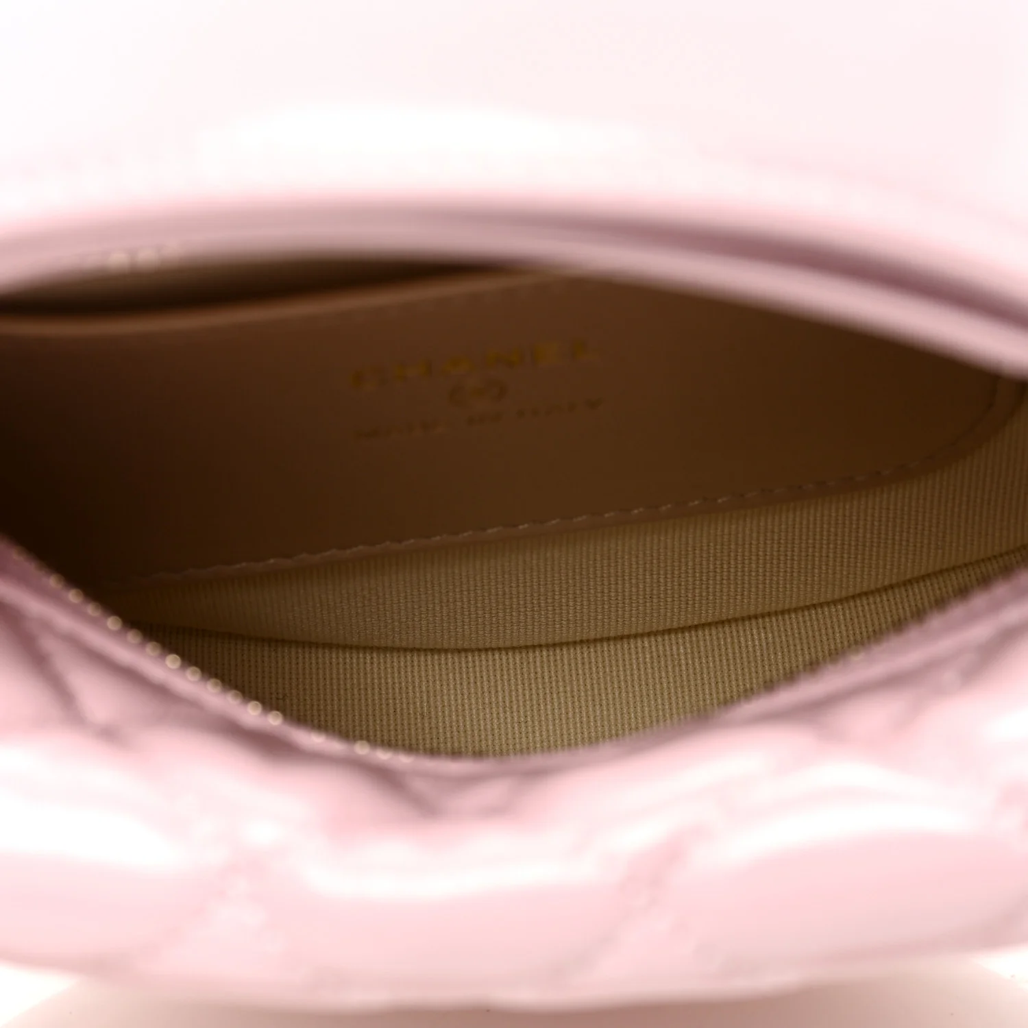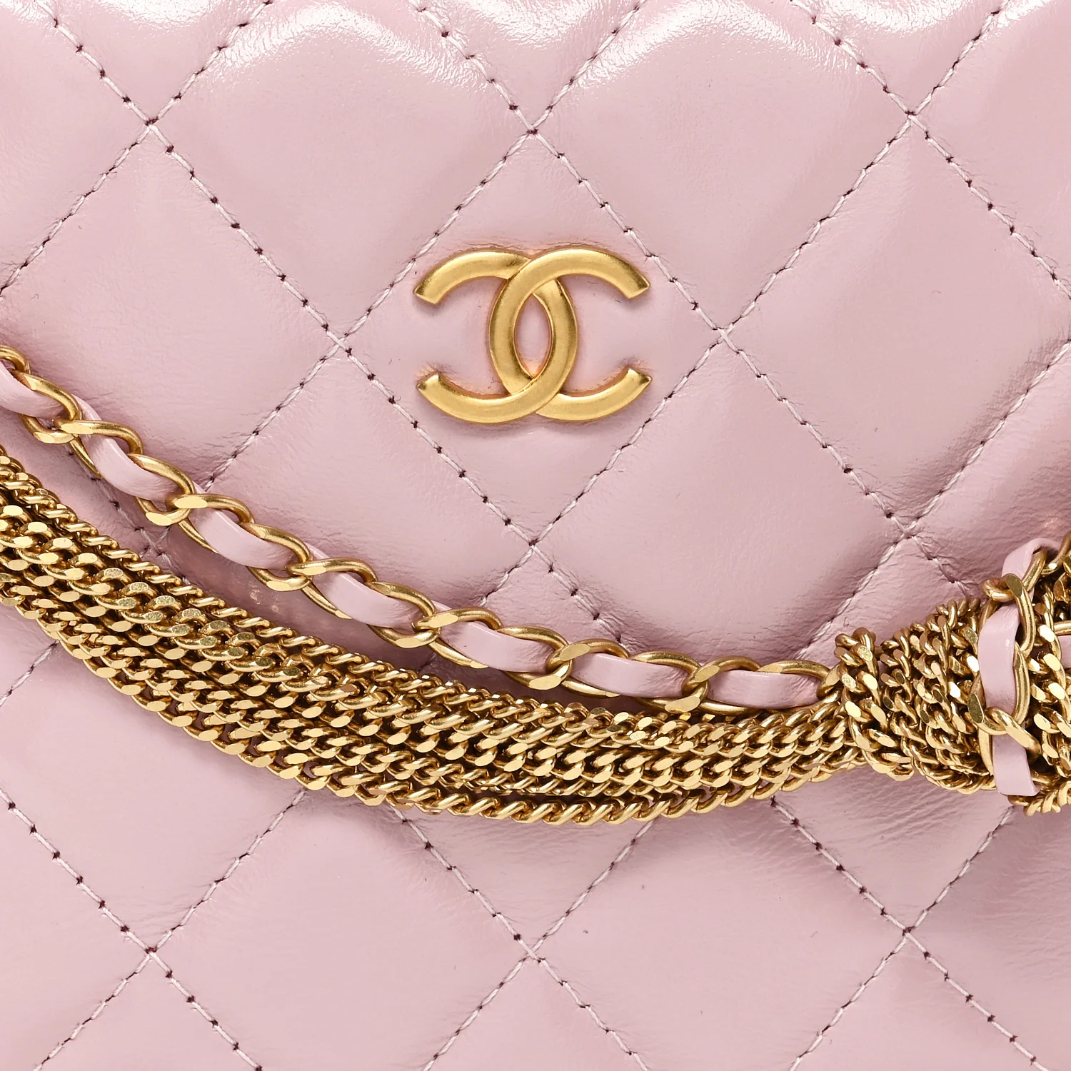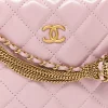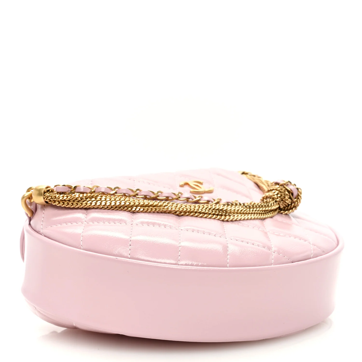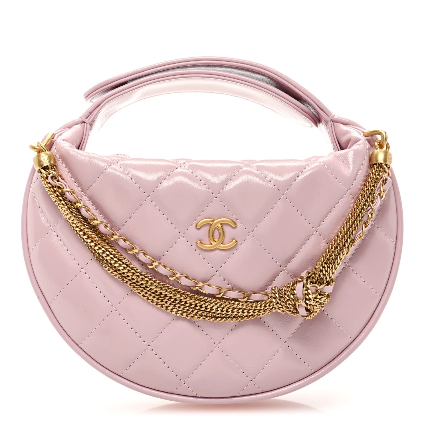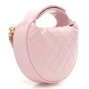CHANEL Shiny Crumpled Calfskin Quilted Bow Pouch Hobo in Light Purple. This chic classic bag is composed of fine diamond-quilted calfskin leather in light purple. This bag features an adjustable leather handle with a snap closure, two gold chains with a matching leather bow, and a gold CC logo on the front. The top opens to a white fabric interior with a leather patch pocket.