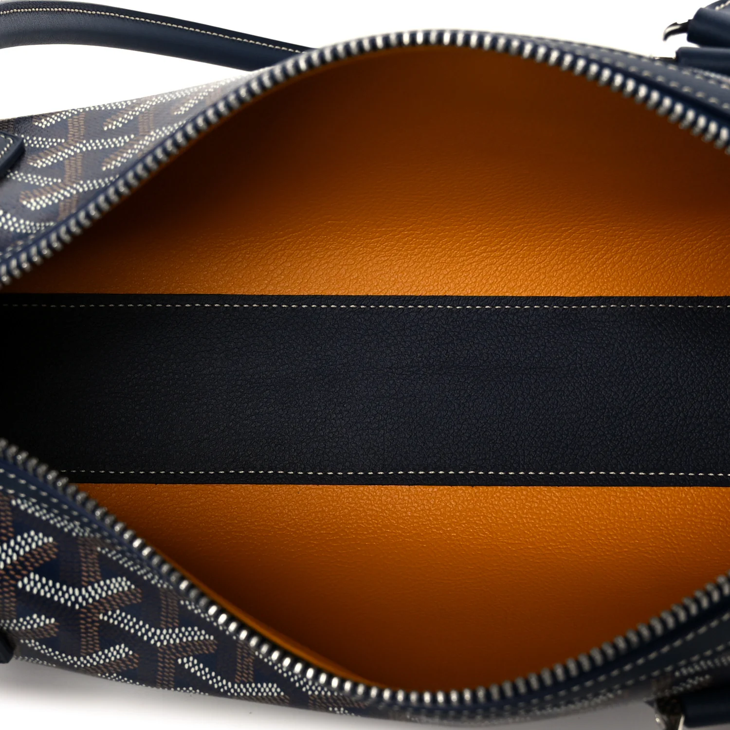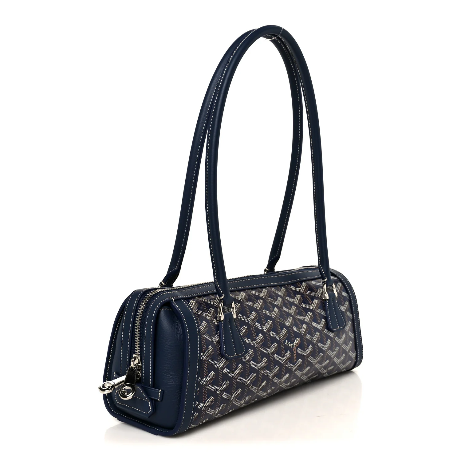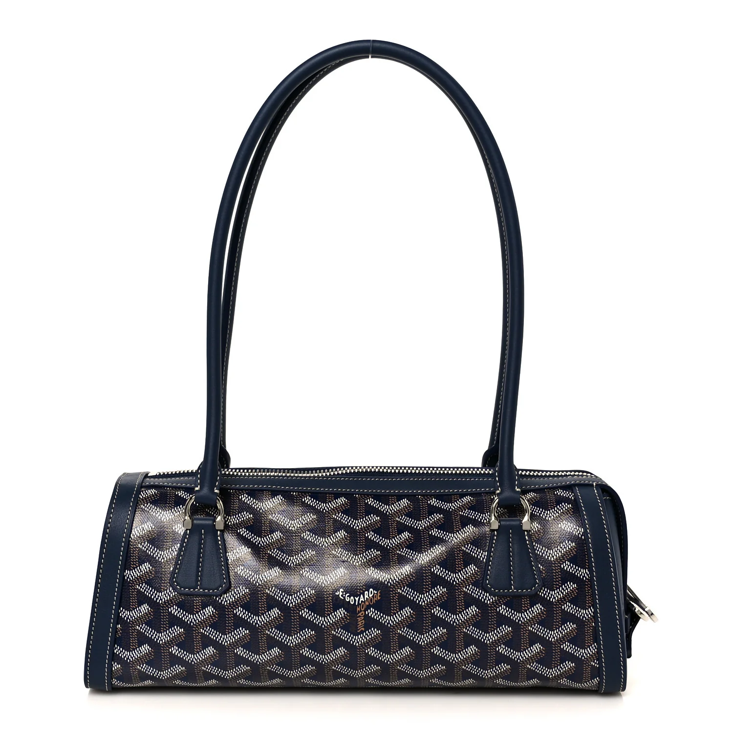GOYARD Goyardine Bonbonniere Bag in Navy. This chic baguette-style shoulder bag is crafted from durable coated canvas featuring the iconic Goyard chevron monogram in navy blue with matching leather trim. It features tall rolled leather handles and polished silver hardware with two zippers that open to a spacious yellow interior.