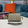 A structured GG Supreme canvas chain super mini shoulder bag with a key ring that can be used to attach this bag to a separate larger bag. The closure has the textured tiger head spur closure-a unique detail referencing the Greek god Dionysus, who in myth is said to have crossed the river Tigris on a tiger sent to him by Zeus. The accessory can also be worn as a crossbody bag.