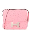 HERMES Ostrich Constance 18 in Rose Pourpre. This stylish shoulder bag is finely crafted of ostrich leather in pink. The bag features a long shoulder strap with silver palladium-plated hardware, including an H buckle at the flap. This opens to a partitioned smooth leather interior with a flat pocket.