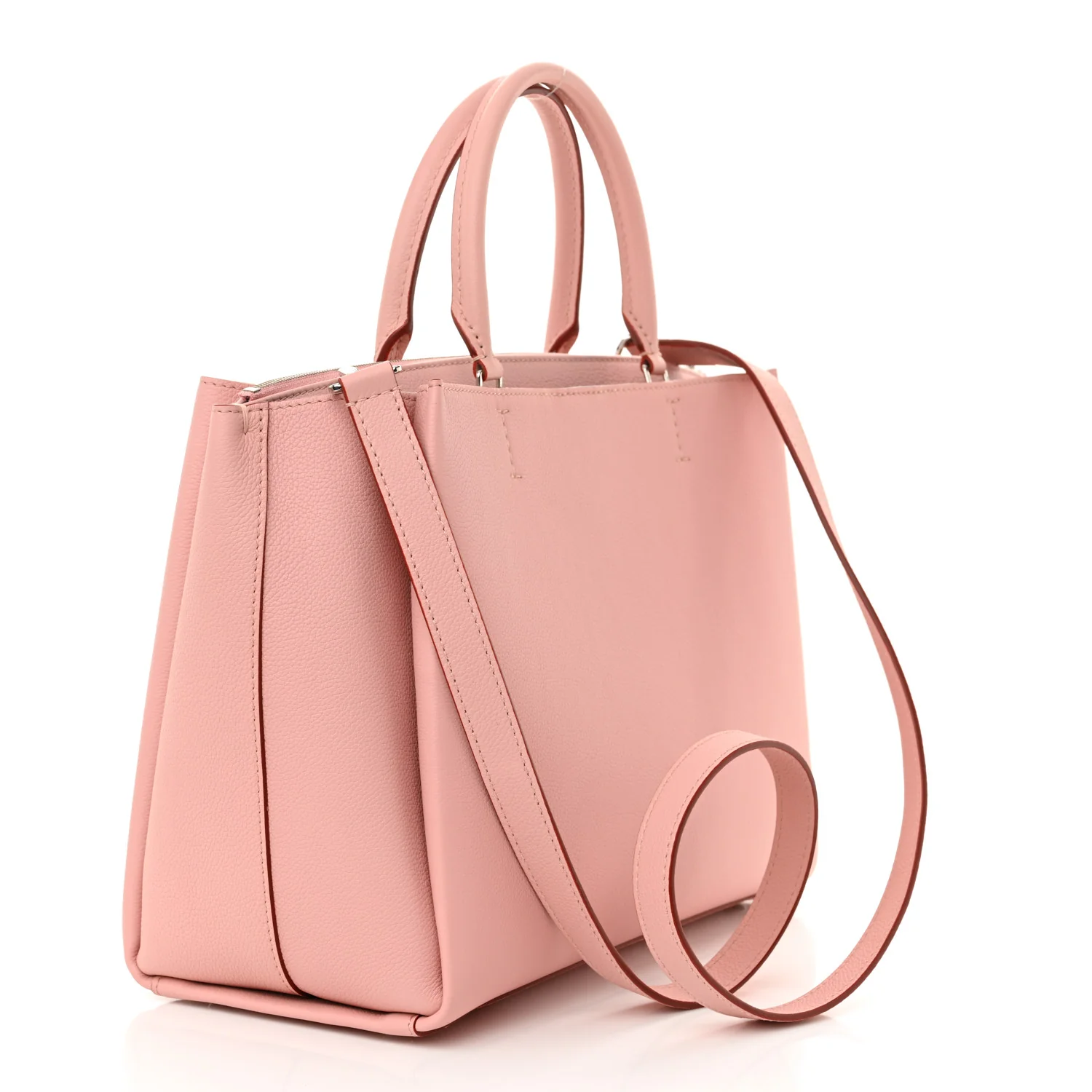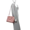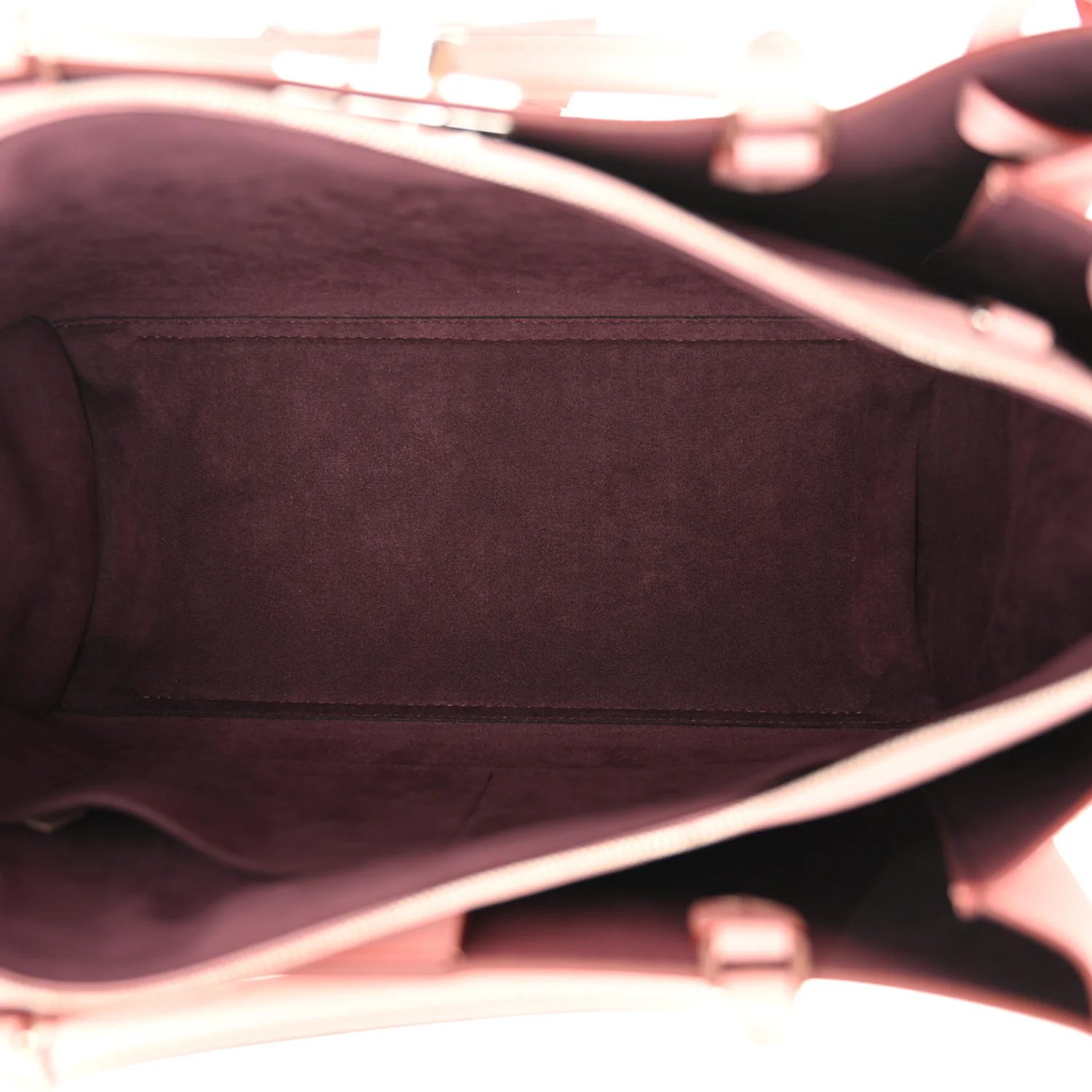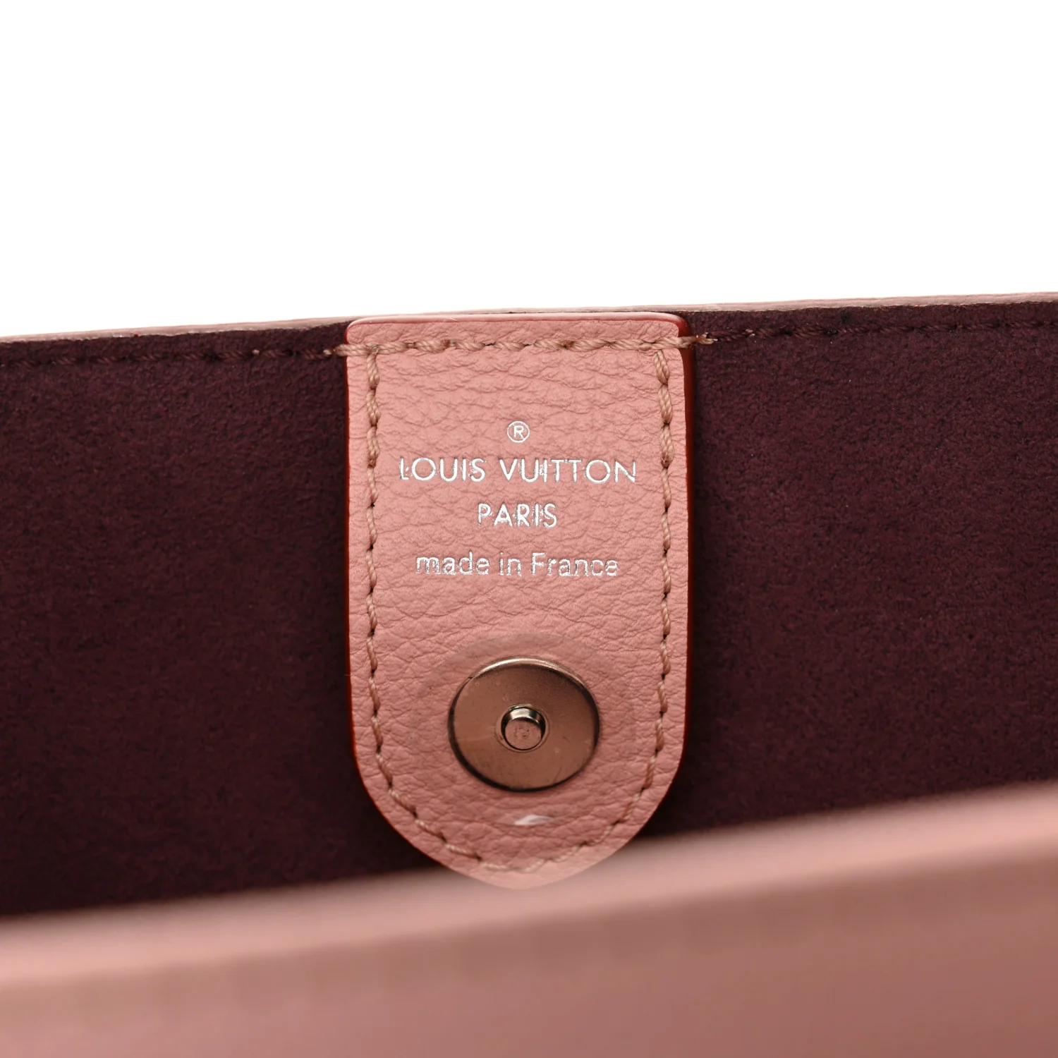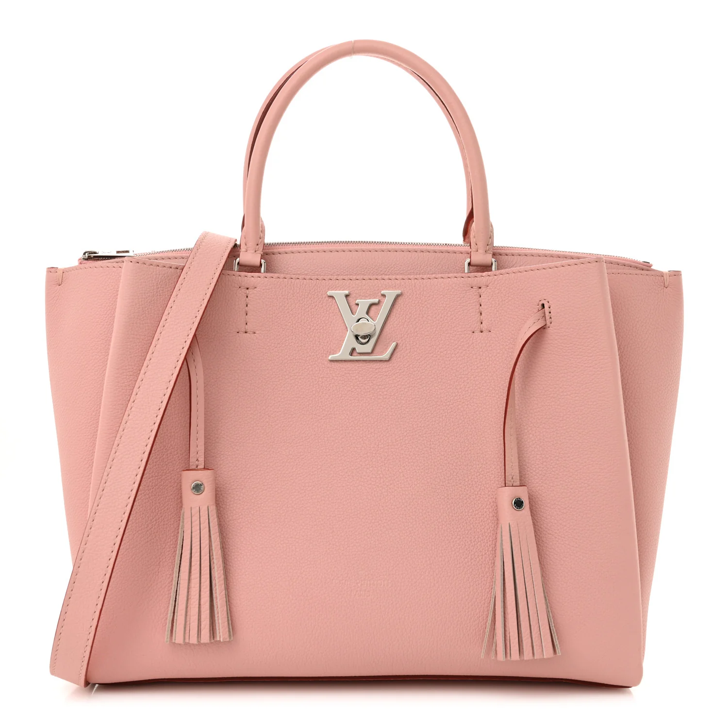 - LOUIS VUITTON Calfskin Lockmeto in Rose Poudre. This chic handbag is crafted of grained calfskin leather in rose pink. The bag features pink leather top handles, a removable pink shoulder strap, pink tassels at the front, and a polished silver Louis Vuitton turn lock. This opens to a partitioned burgundy suede interior with a large center compartment and patch pockets.