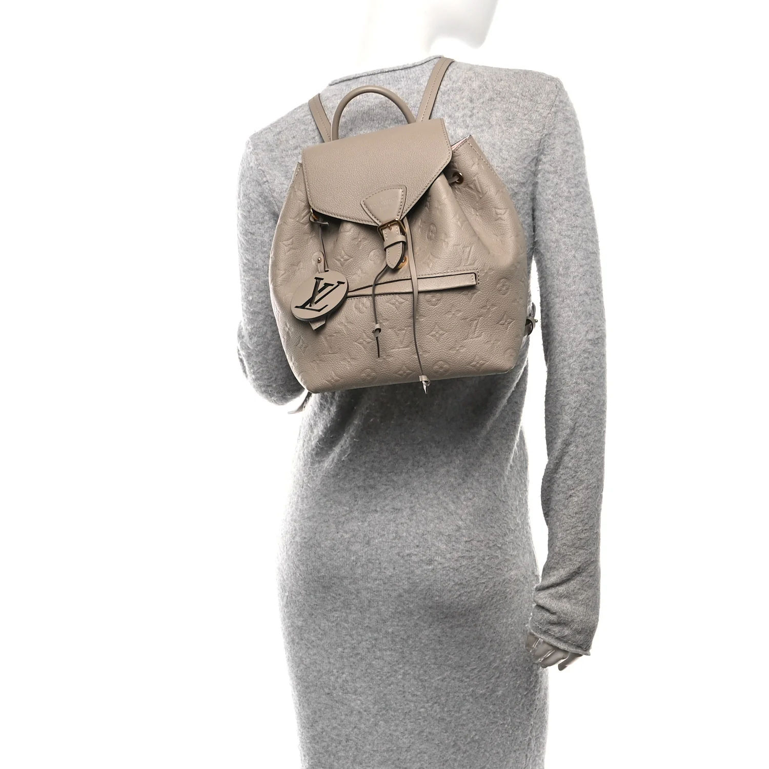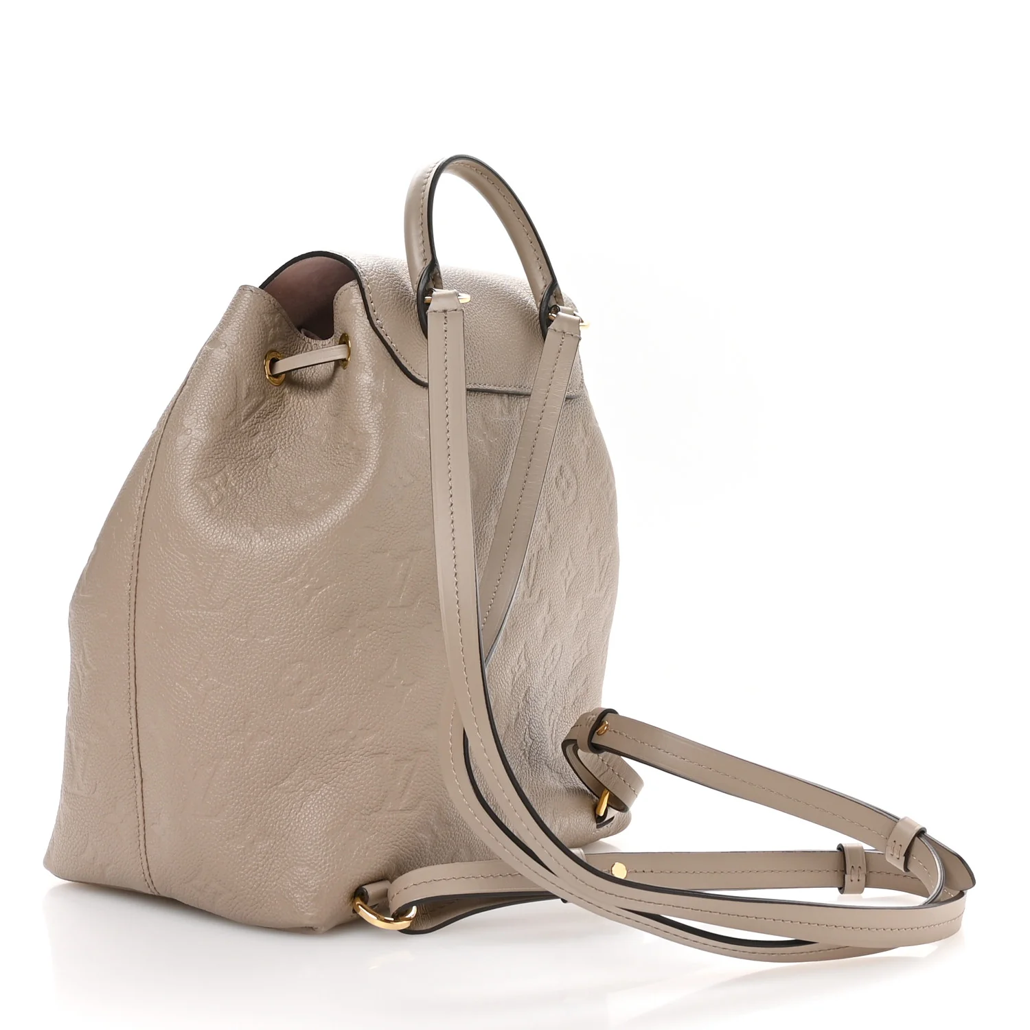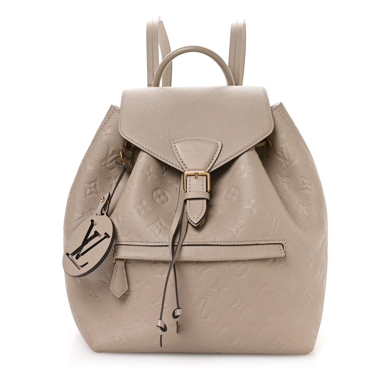LOUIS VUITTON Empreinte Montsouris NM Backpack in Tourterelle. This stylish backpack is crafted of the classic Louis Vuitton Empreinte canvas in beige. It features an adjustable shoulder straps with polished gold hardware, a front zipper pocket, and opens with a belt buckle closure to a pink microfiber interior with a patch pocket.