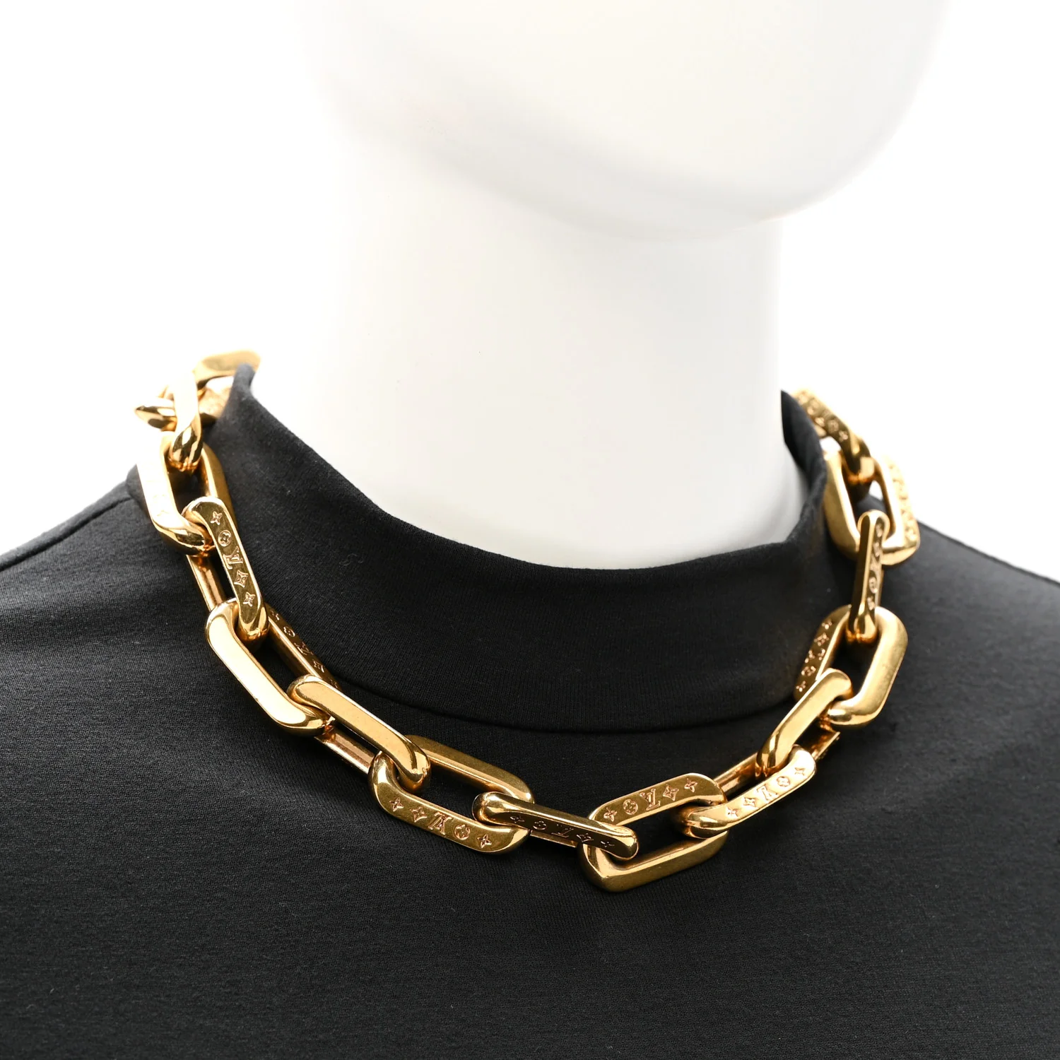 LOUIS VUITTON LV Edge Necklace MM in Gold . This iconic necklace features a gold tone chain engraved with the iconic LV