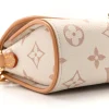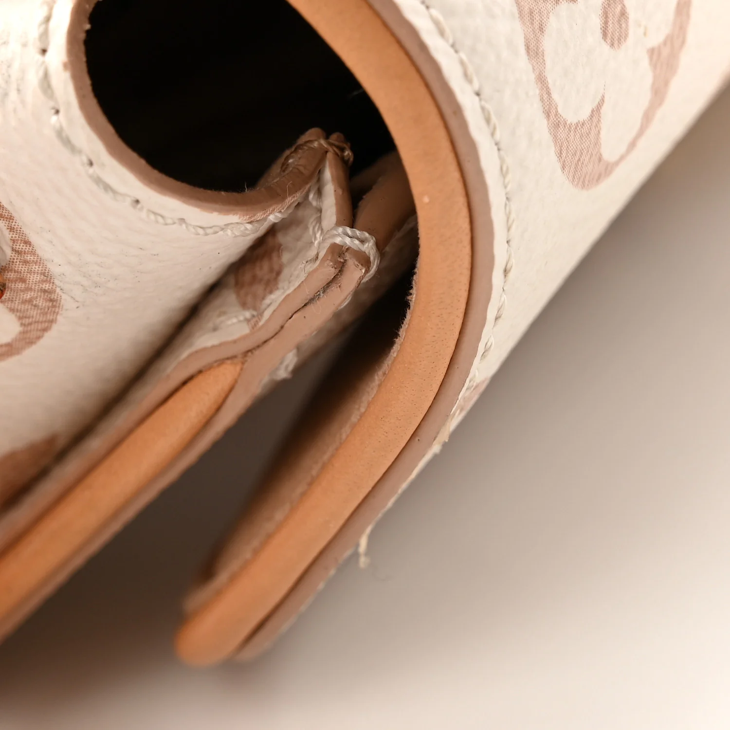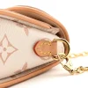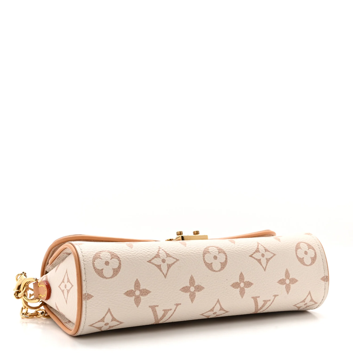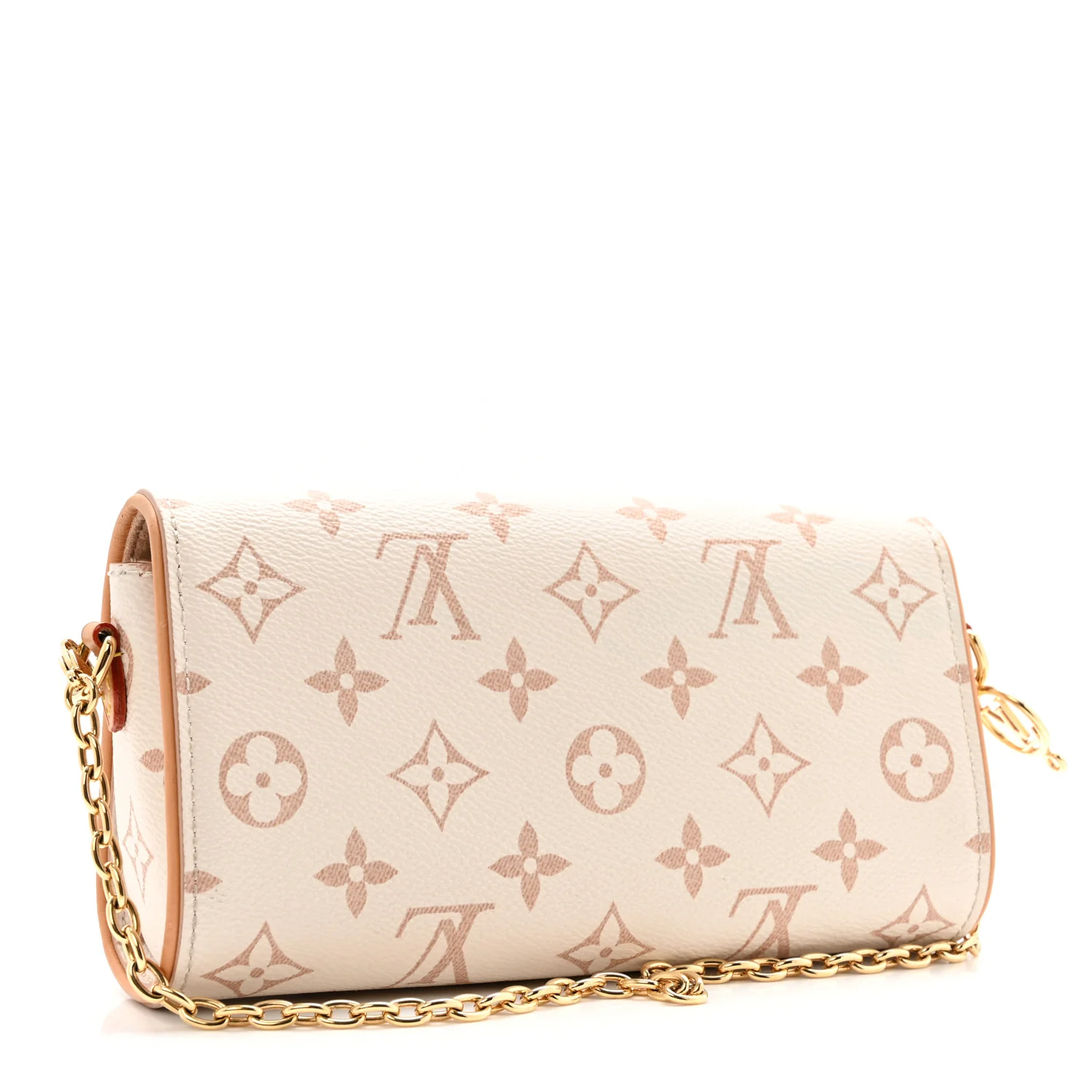 LOUIS VUITTON Monogram Camille Pochette in Dune. This stylish clutch is finely crafted of Louis Vuitton monogrammed coated canvas in white and beige with vachetta leather trim. The bag features an optional and removable chain strap and gold-toned hardware. The flap opens with a polished brass S-lock to a compact beige microfiber interior.