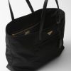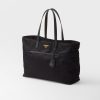 - This tote bag with timeless charm, a re-edition of an archive design, sums up Prada codes in a sophisticated and pragmatic silhouette. The style with clean lines is made of Re-Nylon, an innovative regenerated nylon fabric that is the sustainable evolution of a distinctive material of the brand. Elegant Saffiano details complete the roomy accessory decorated with the iconic signature touch of the enameled metal triangle logo.