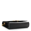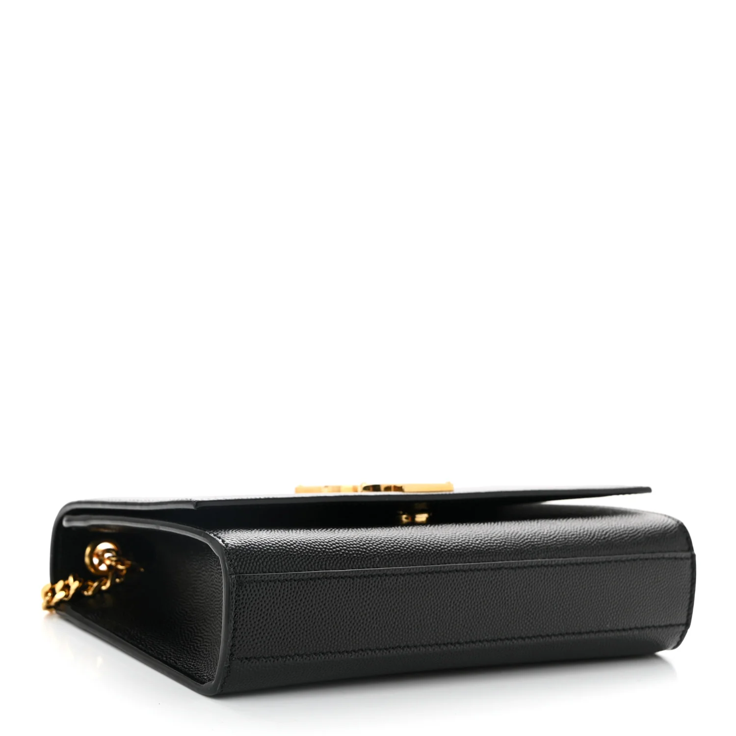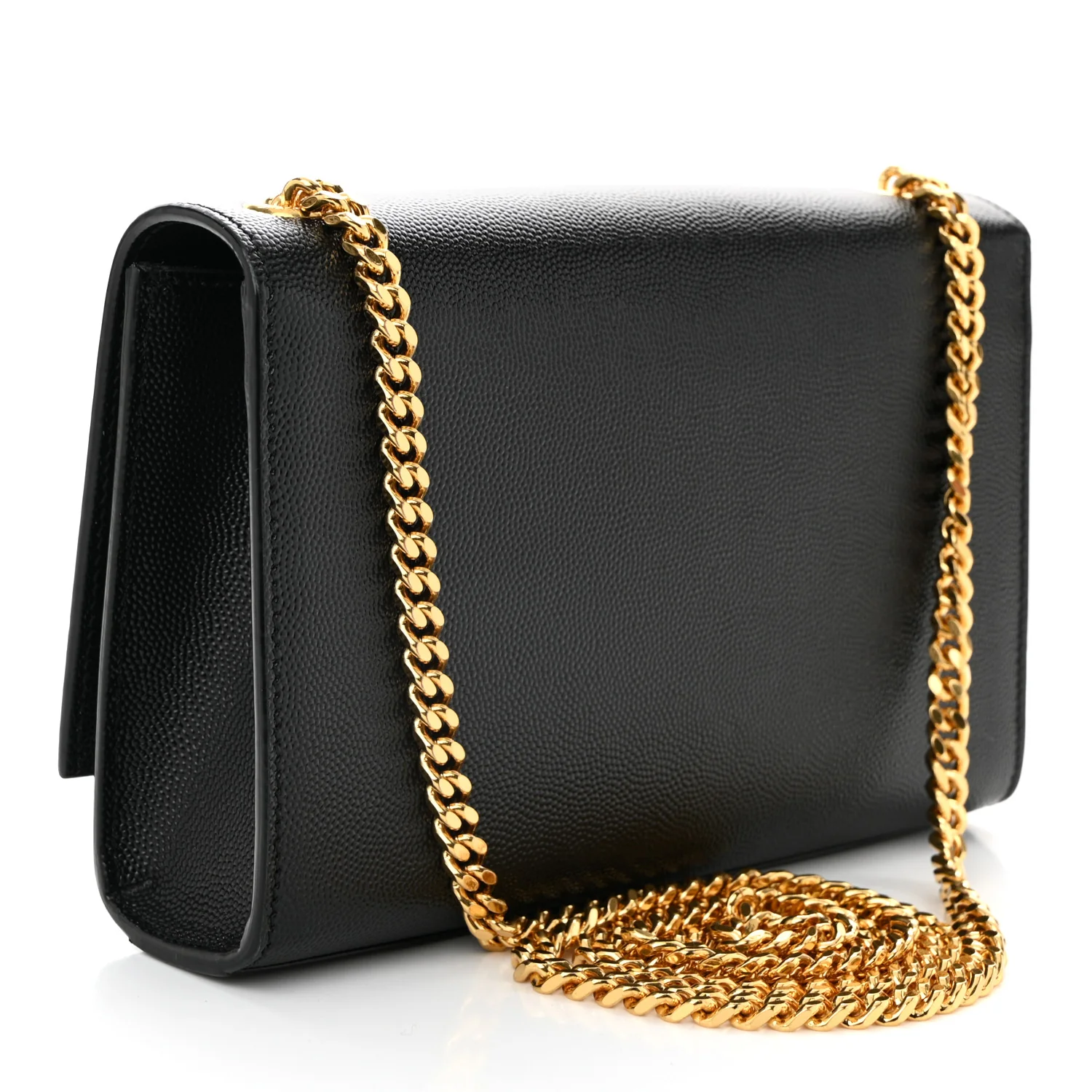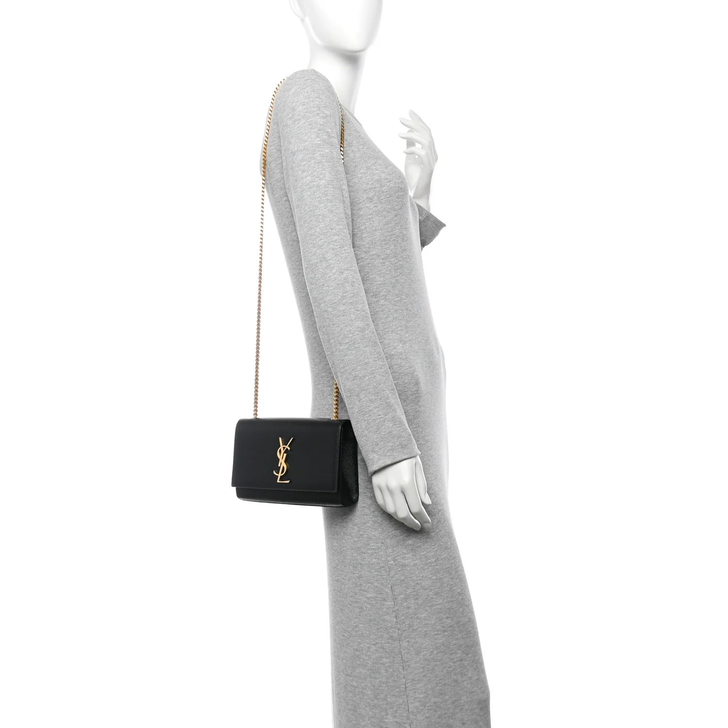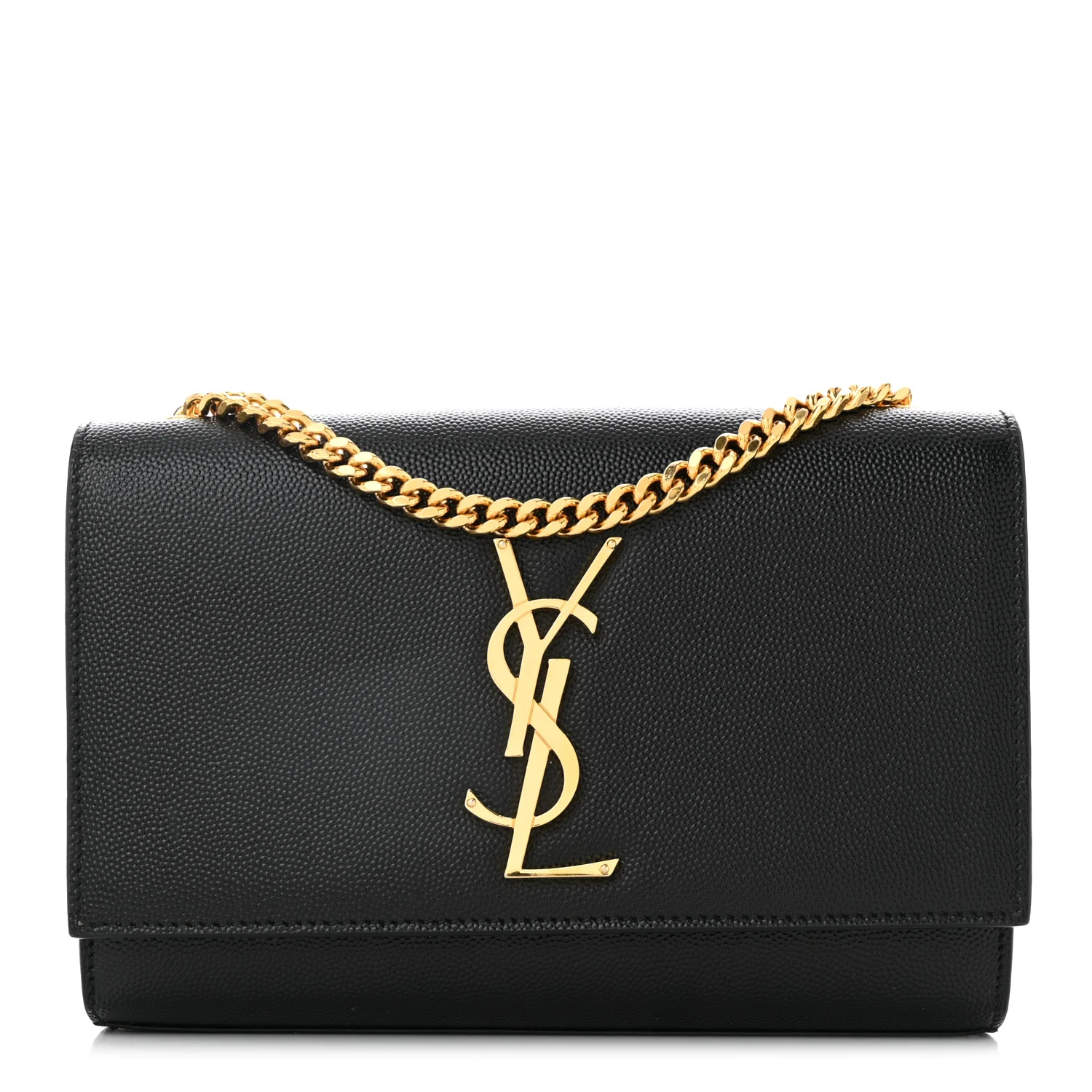 SAINT LAURENT Grain De Poudre Small Monogram Kate Satchel in Black. This ultra-stylish shoulder bag is finely crafted of grained calfskin leather in black. The bag features a gold bijoux shoulder strap and a crossover flap with a matching gold YSL logo. The flap opens to a black fabric interior with a patch pocket.
