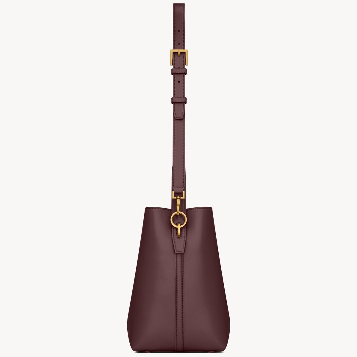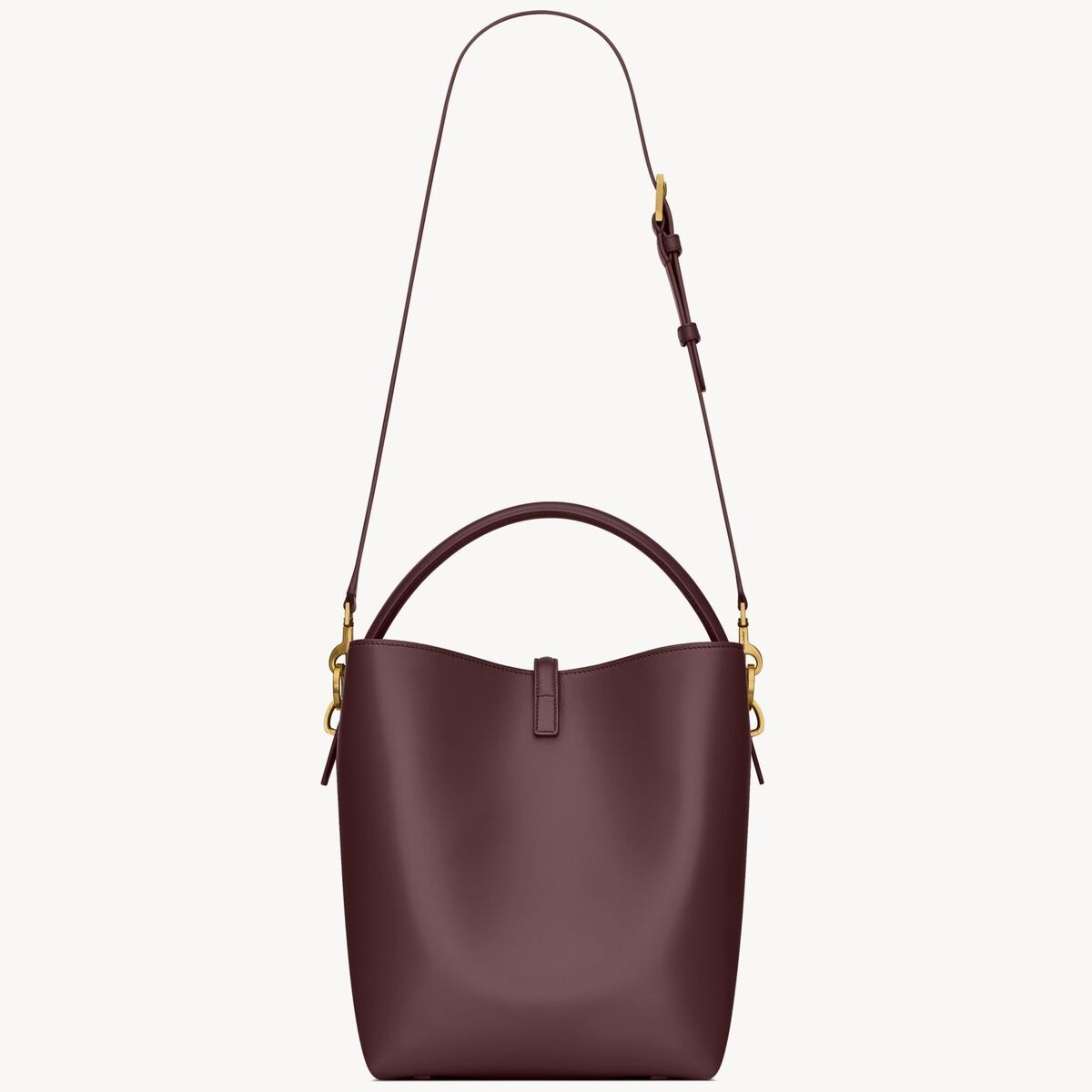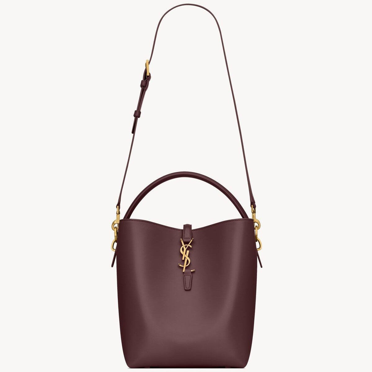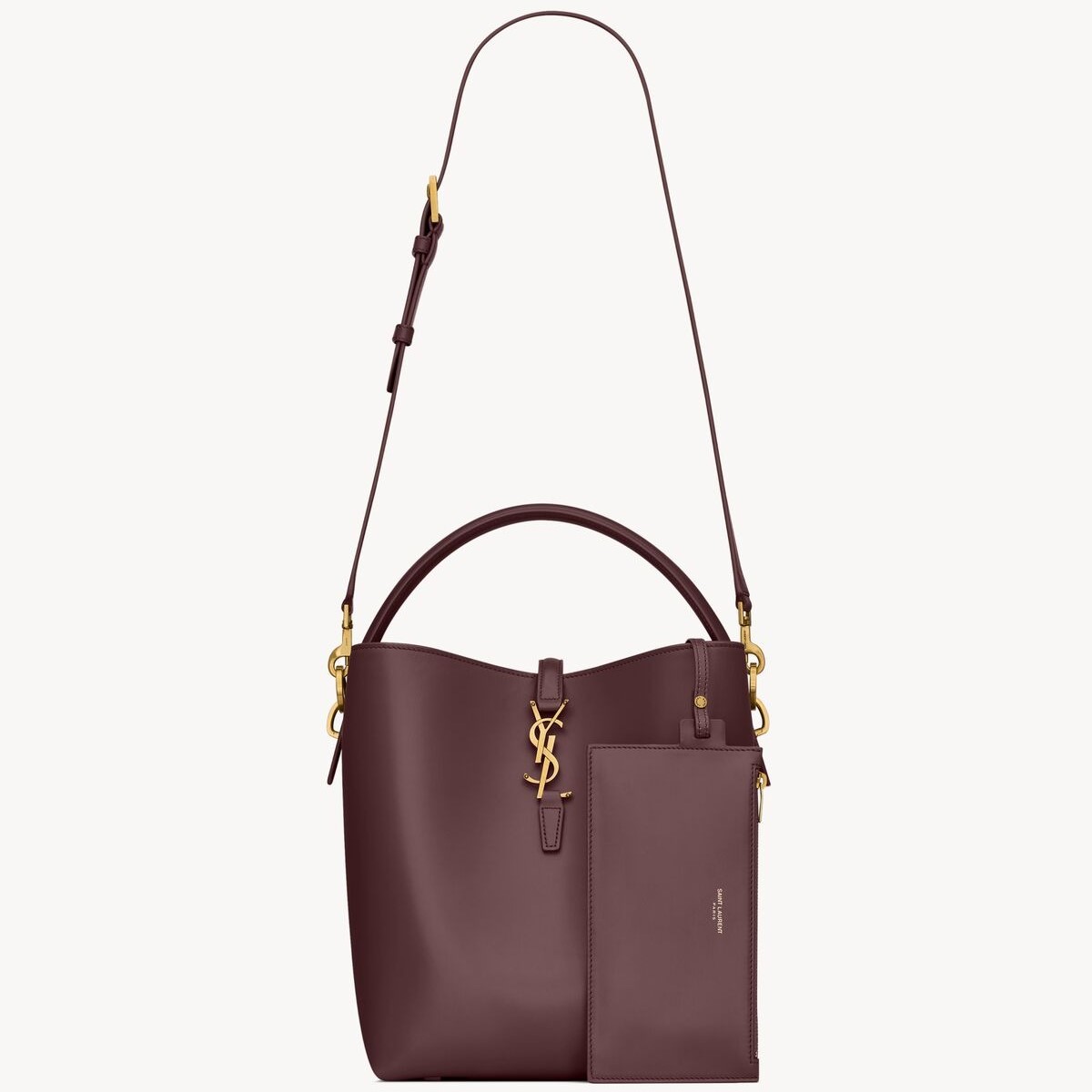 Bucket bag featuring the cassandre hook closure, top handle and an adjustable and detachable shoulder strap. The piece is complete with a removable zip pouch.