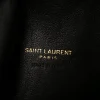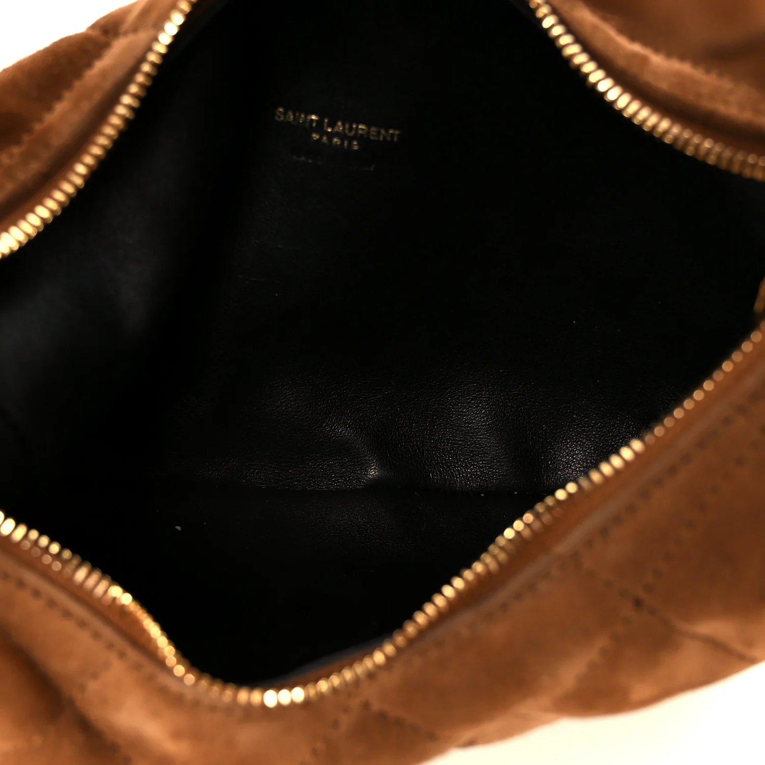 - SAINT LAURENT Suede Quilted Icarino Bag in Cognac. This chic tote is crafted with suede leather in brown. It features a matching handle and an aged gold YSL logo on the front. The top zipper opens to a black leather interior
