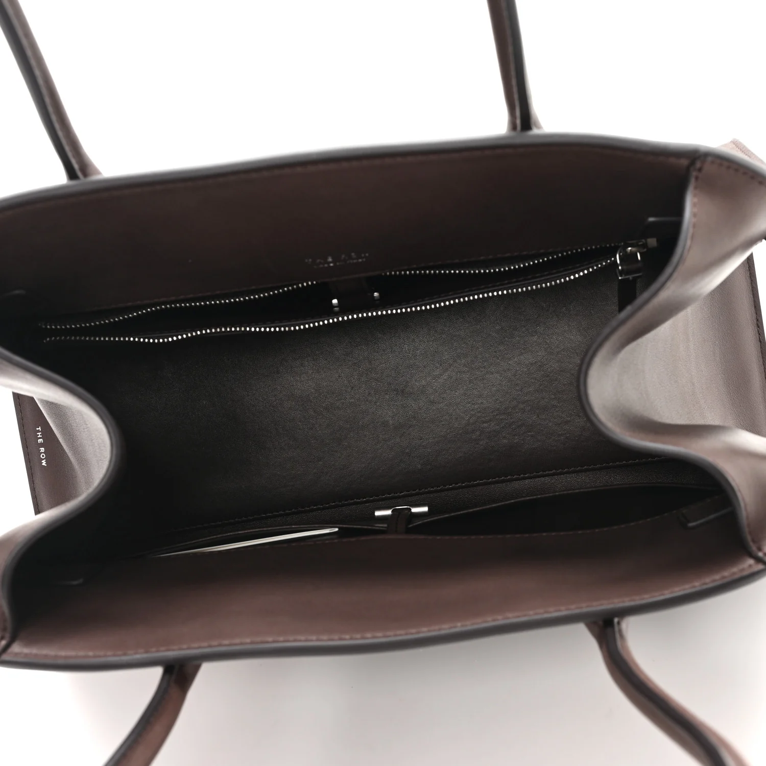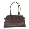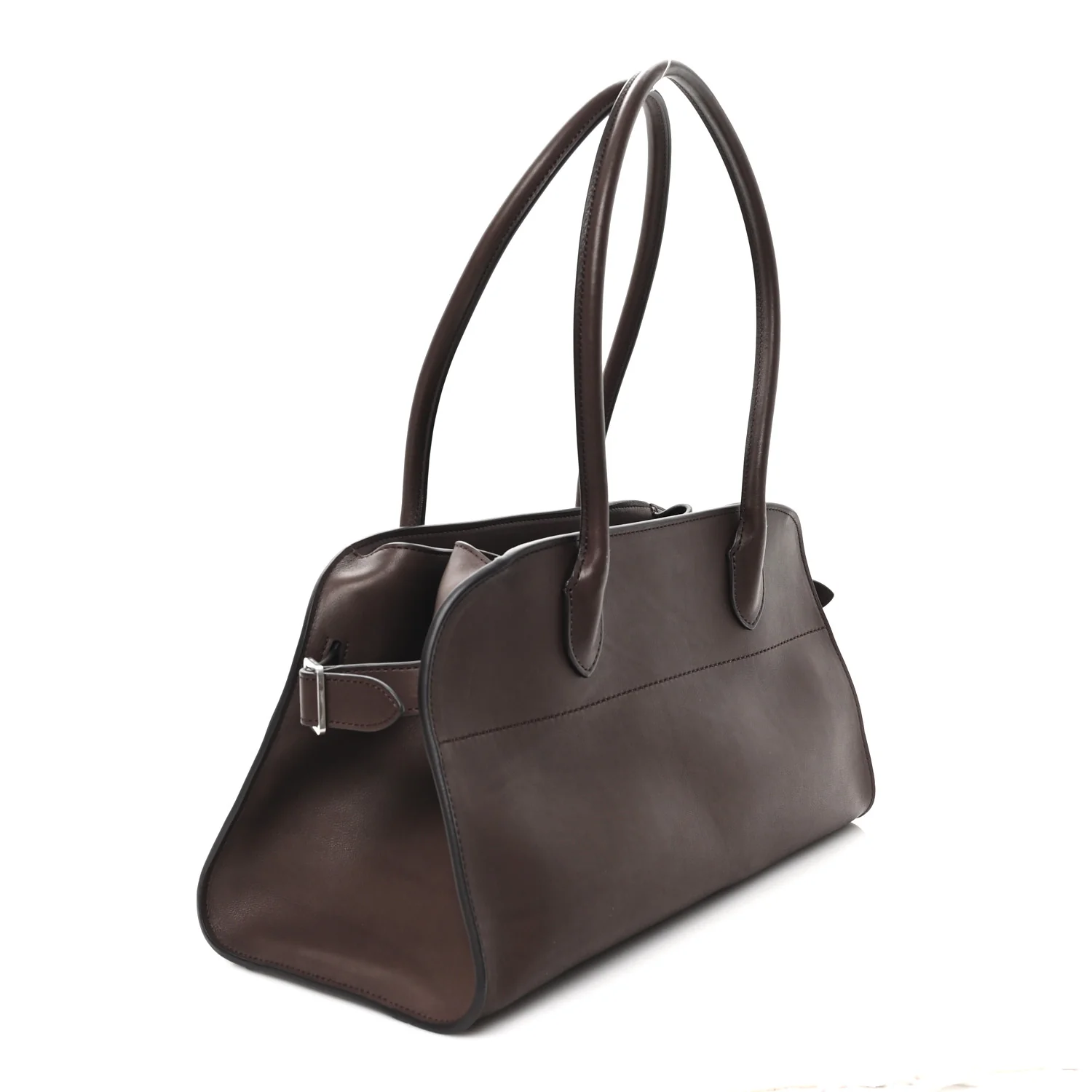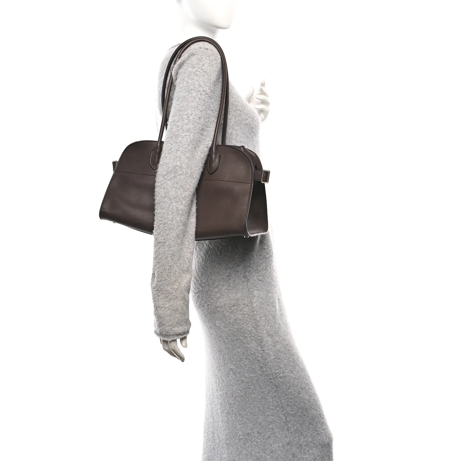 THE ROW Polished Saddle Calfskin Margaux Shoulder 12 in Hippo Grey. This shoulder bag is crafted of smooth calfskin leather in brown with matching rolled leather top handles. It features adjustable side buckles and opens to a matching leather interior with zipper and patch pockets.