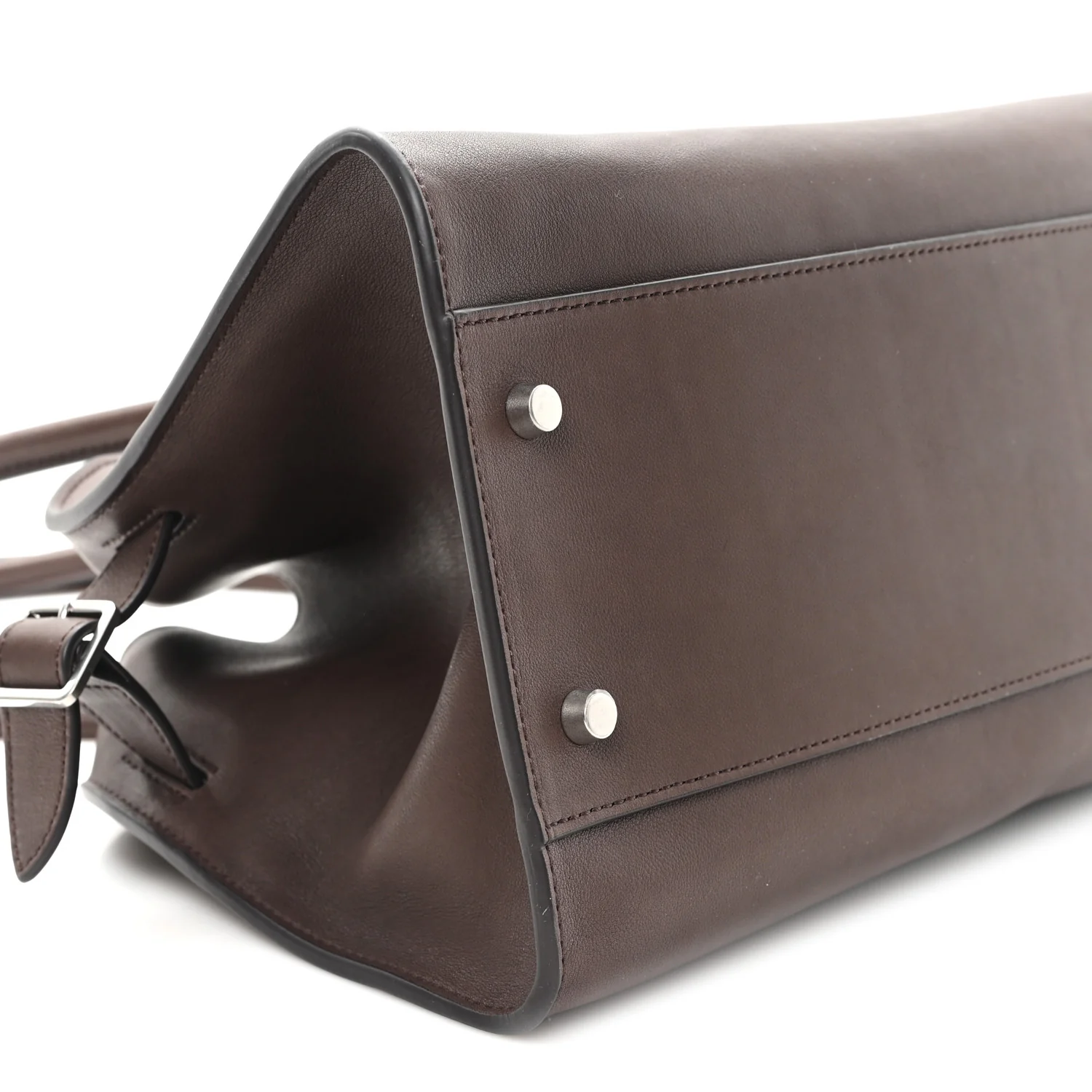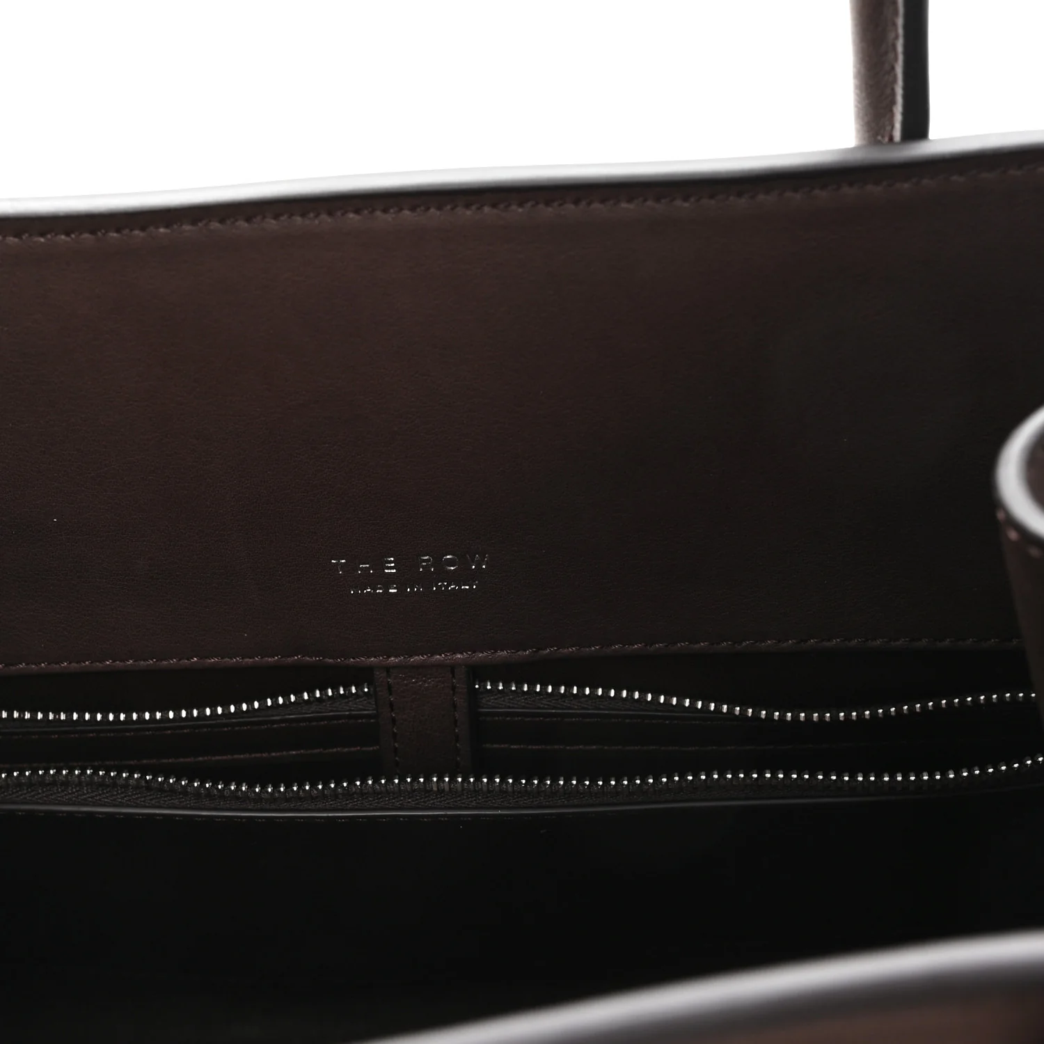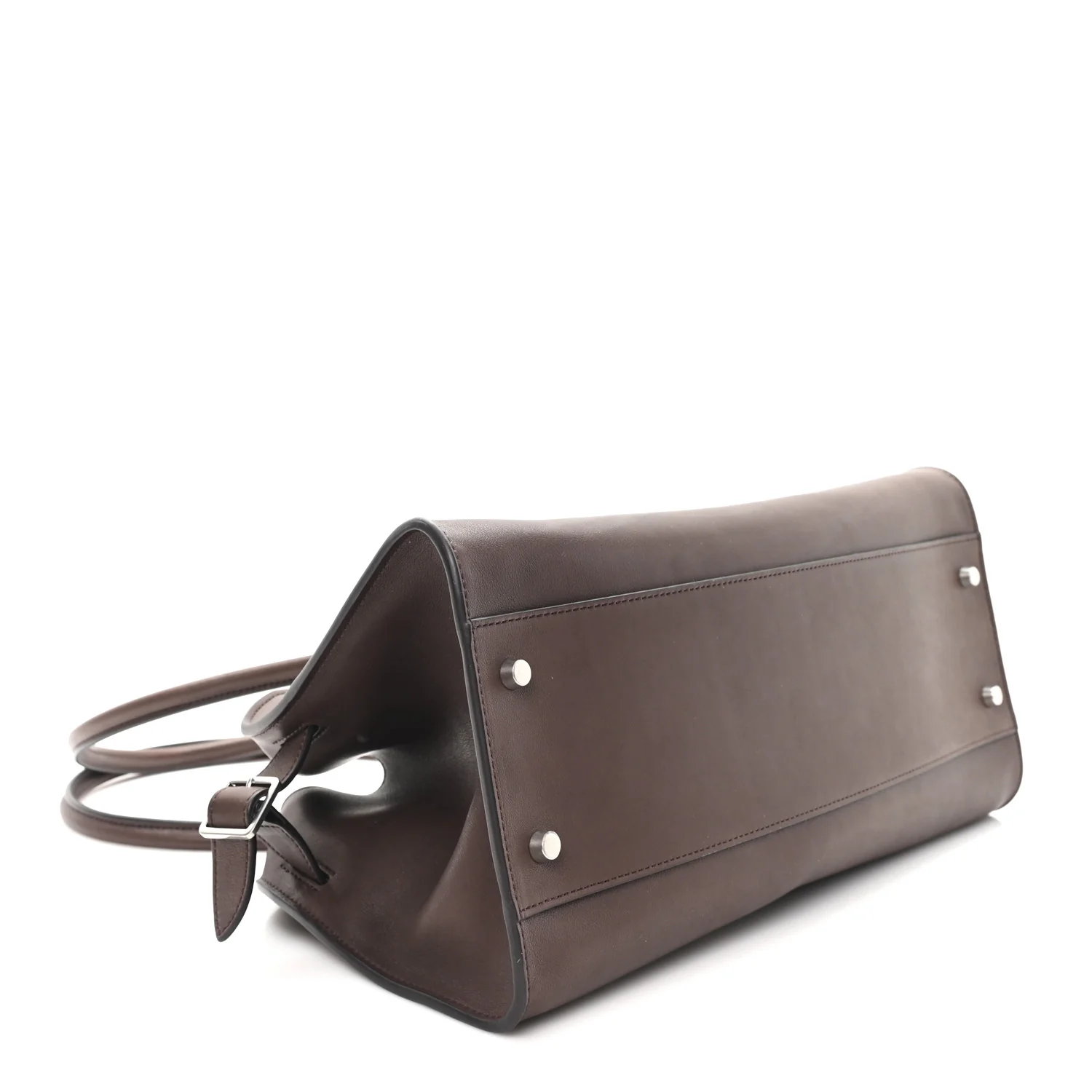 THE ROW Polished Saddle Calfskin Margaux Shoulder 12 in Hippo Grey. This shoulder bag is crafted of smooth calfskin leather in brown with matching rolled leather top handles. It features adjustable side buckles and opens to a matching leather interior with zipper and patch pockets.